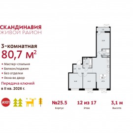 Трехкомнатная квартира бизнес-класса в ЖК "Скандинавия" на 12 этаже. Квартира без отделки, новый собственник может сделать ремонт по своему проекту. Общая площадь: 80.7 кв.м., жилая: 36.8 кв.м., площадь просторной кухни-столовой: 27.5 кв.м. Квартира - распашонка, без проходных комнат,...