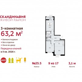 3-комн. квартира бизнес-класса с европланировкой от застройщика в ЖК "Скандинавия" на 9 этаже. Квартира без отделки, после оформления собственности можно делать ремонт. Общая площадь: 63.2 кв.м., жилая: 37.6 кв.м., общая площадь гостиной-столовой с кухонной зоной: 20.4 кв.м....