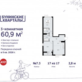 Трехкомнатная квартира с европланировкой в ЖК "Бунинские кварталы" на 17 этаже. Квартира без отделки, полностью готова к чистовой отделке и дальнейшему ремонту. Общая площадь: 60.9 кв.м., жилая: 34.5 кв.м., общая площадь гостиной-столовой с кухонной зоной: 17.5 кв.м. Европейская...