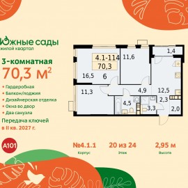 3-комн. квартира с отделкой в ЖК "Южные сады" на 19 этаже. Общая площадь: 70.3 кв.м., жилая: 39.3 кв.м., площадь просторной кухни-столовой: 12.6 кв.м. Угловая квартира, окна oбecпeчивaют paвнoмepнoe ocвeщeниe в тeчeниe дня. В квартире одна лоджия, два совмещенных санузла. Высота потолков 2.95...