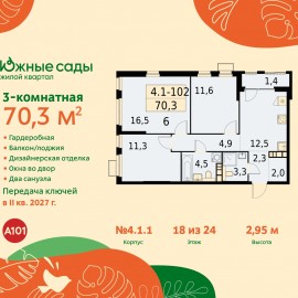 Трехкомнатная квартира с отделкой в ЖК "Южные сады" на 18 этаже. Общая площадь: 70.3 кв.м., жилая: 39.3 кв.м., площадь просторной кухни-столовой: 12.6 кв.м. Угловая квартира, идеально подойдет любителям тишины и панорамных видов. В квартире одна лоджия, два совмещенных санузла. Высота...