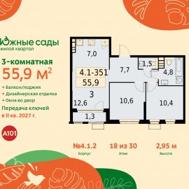 3-комн. квартира с европланировкой и отделкой в ЖК "Южные сады" на 18 этаже. Общая площадь: 55.9 кв.м., жилая: 33.4 кв.м., суммарная площадь гостиной-столовой с кухонной зоной: 19.7 кв.м. Европейская планировка, кухня-гостиная - идеальный вариант для тех, кто любит часто принимать...