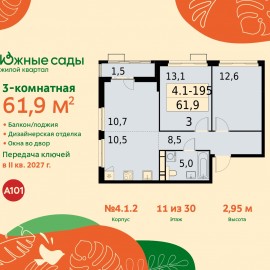 3-комн. квартира с европланировкой и отделкой в ЖК "Южные сады" на 11 этаже. Общая площадь: 61.9 кв.м., жилая: 36.4 кв.м., суммарная площадь гостиной-столовой с кухонной зоной: 21.2 кв.м. Европланировка, зона гостиной комнаты объединена с кухней. Квартира угловая, окна oбecпeчивaют...