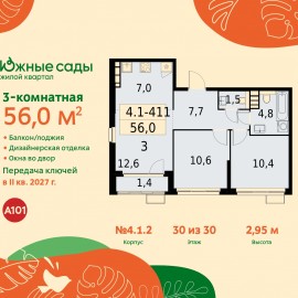Трехкомнатная квартира с европланировкой и отделкой в ЖК "Южные сады" на 27 этаже. Общая площадь: 56 кв.м., жилая: 33.4 кв.м., суммарная площадь гостиной-столовой с кухонной зоной: 19.7 кв.м. Европланировка, зона гостиной комнаты объединена с кухней. Комнаты изолированные, все окна...