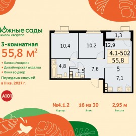 3-комн. квартира с европланировкой и отделкой в ЖК "Южные сады" на 30 этаже. Общая площадь: 56 кв.м., жилая: 33.4 кв.м., общая площадь гостиной-столовой с кухонной зоной: 19.7 кв.м. Европейская планировка, кухня-гостиная - идеальный вариант для тех, кто любит часто принимать гостей....