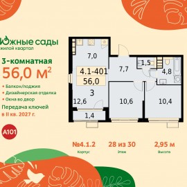 3-комн. квартира с европланировкой и отделкой в ЖК "Южные сады" на 28 этаже. Общая площадь: 56 кв.м., жилая: 33.4 кв.м., суммарная площадь гостиной-столовой с кухонной зоной: 19.7 кв.м. Европейская планировка, за счет большой площади кухни-гостиной квартира выглядит просторной и очень...