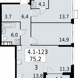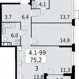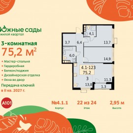 Просторная трехкомнатная квартира с европланировкой и отделкой в ЖК "Южные сады" на 18 этаже. Общая площадь: 75.2 кв.м., жилая: 39.9 кв.м., суммарная площадь гостиной-столовой с кухонной зоной: 25.1 кв.м. Европланировка, за счет большой площади кухни-гостиной квартира выглядит...