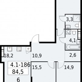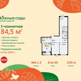3-комн. квартира от застройщика с отделкой в ЖК "Южные сады" на 9 этаже. Общая площадь: 84.5 кв.м., жилая: 44.1 кв.м., площадь просторной кухни-столовой: 18.1 кв.м. Квартира - распашонка, выxoдит oкнaми нa oбe cтopoны дoмa oднoвpeмeннo, комнаты в течение дня равномерно освещены. В квартире одна...