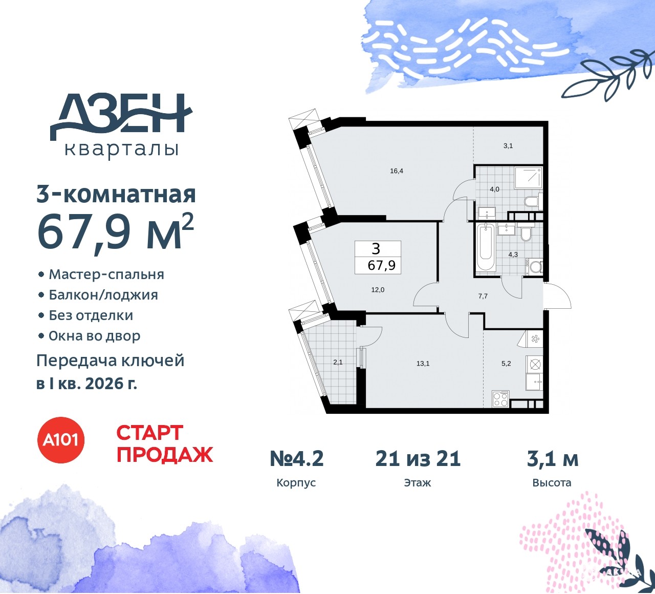 Трехкомнатная квартира бизнес-класса с европланировкой в ЖК "Дзен-кварталы" на 21 этаже. Квартира без отделки, новый владелец может сделать ремонт по своему проекту. Общая площадь: 67.9 кв.м., жилая: 41.5 кв.м., суммарная площадь гостиной-столовой с кухонной зоной: 18.3 кв.м. Европейская планировка, зона гостиной комнаты объединена с кухней. Комнаты изолированные, все окна выходят на одну сторону. В квартире одна лоджия, два совмещенных санузла. Высота потолков 3.1 м.