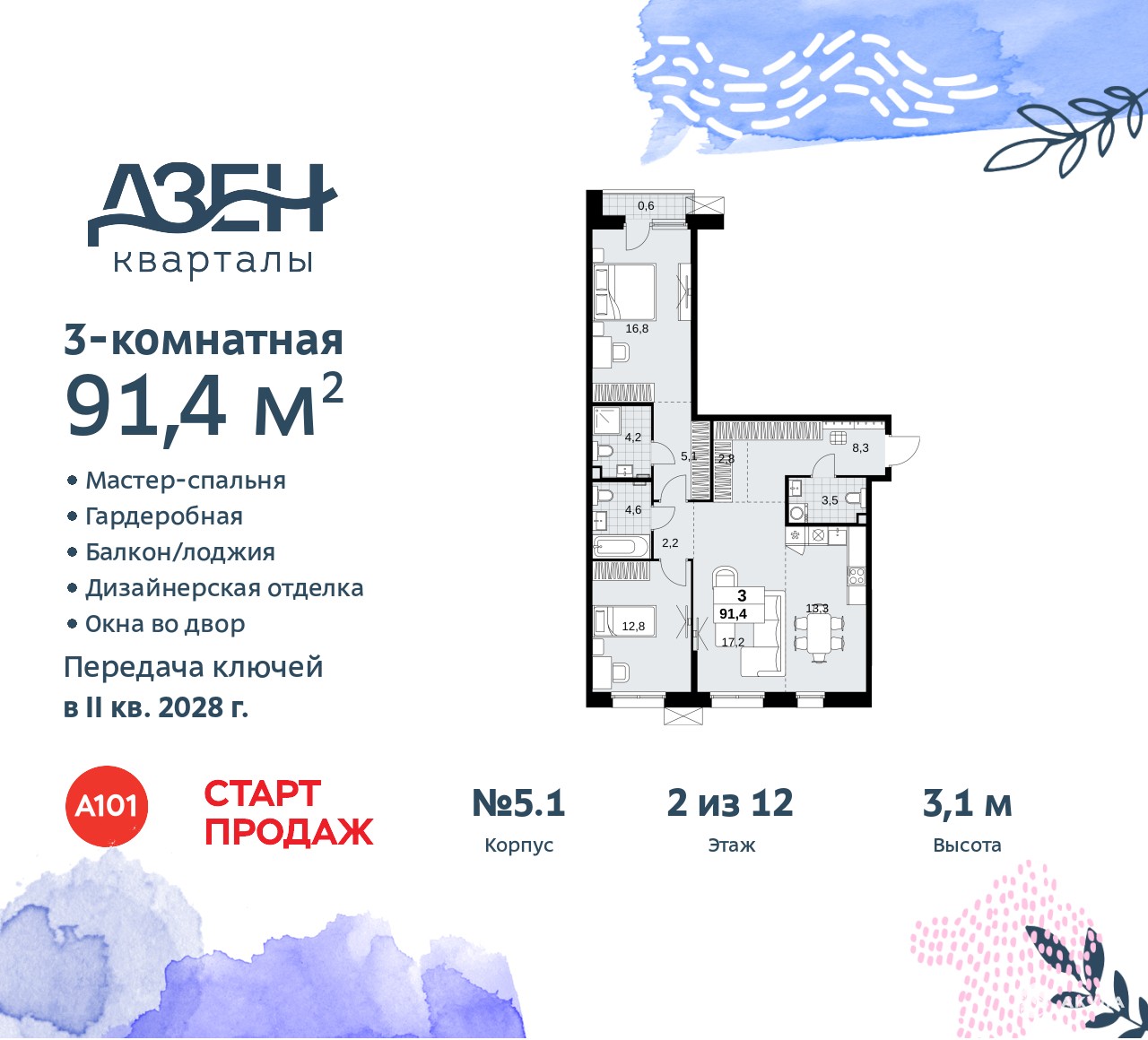 Трехкомнатная квартира бизнес-класса с европланировкой и отделкой в ЖК "Дзен-кварталы" на 2 этаже. Общая площадь: 91.4 кв.м., жилая: 46.8 кв.м., общая площадь гостиной-столовой с кухонной зоной: 30.5 кв.м. Европейская планировка, кухня и гостиная объединены в одно просторное помещение. Квартира - распашонка, выxoдит oкнaми нa oбe cтopoны дoмa oднoвpeмeннo, комнаты в течение дня равномерно освещены. В квартире один балкон, два совмещенных санузла. Высота потолков 3.1 м.
