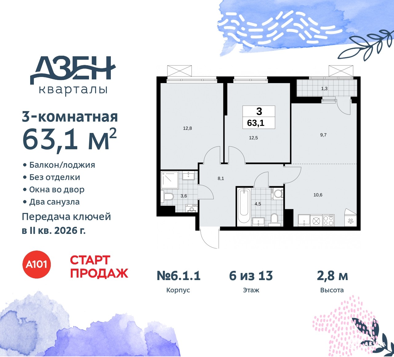 Продается 3-комн. квартира с европланировкой от застройщика в ЖК "Дзен-кварталы" на 6 этаже. Квартира без отделки, новый владелец может сделать ремонт по своему дизайн-проекту. Общая площадь: 63.1 кв.м., жилая: 35 кв.м., суммарная площадь гостиной-столовой с кухонной зоной: 20.3 кв.м. Европланировка, кухня-гостиная - идеальный вариант для тех, кто любит часто принимать гостей. Комнаты изолированные, все окна выходят на одну сторону. В квартире одна лоджия, два совмещенных санузла. Высота потолков 2.8 м.