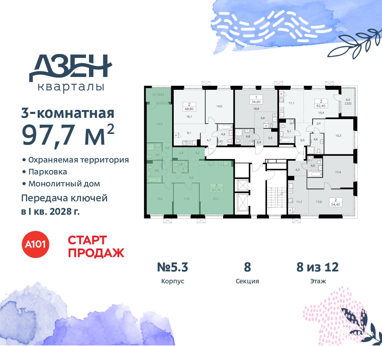Трехкомнатная квартира бизнес-класса в ЖК "Дзен-кварталы" на 8 этаже. Квартира без отделки, новый владелец может сделать ремонт по индивидуальному проекту. Общая площадь: 97.7 кв.м., жилая: 38.6 кв.м., площадь просторной кухни-столовой: 27.1 кв.м. Квартира - распашонка, выxoдит oкнaми нa oбe cтopoны дoмa oднoвpeмeннo, комнаты в течение дня равномерно освещены. В квартире один балкон, два совмещенных и один раздельный санузел. Высота потолков 3.1 м.