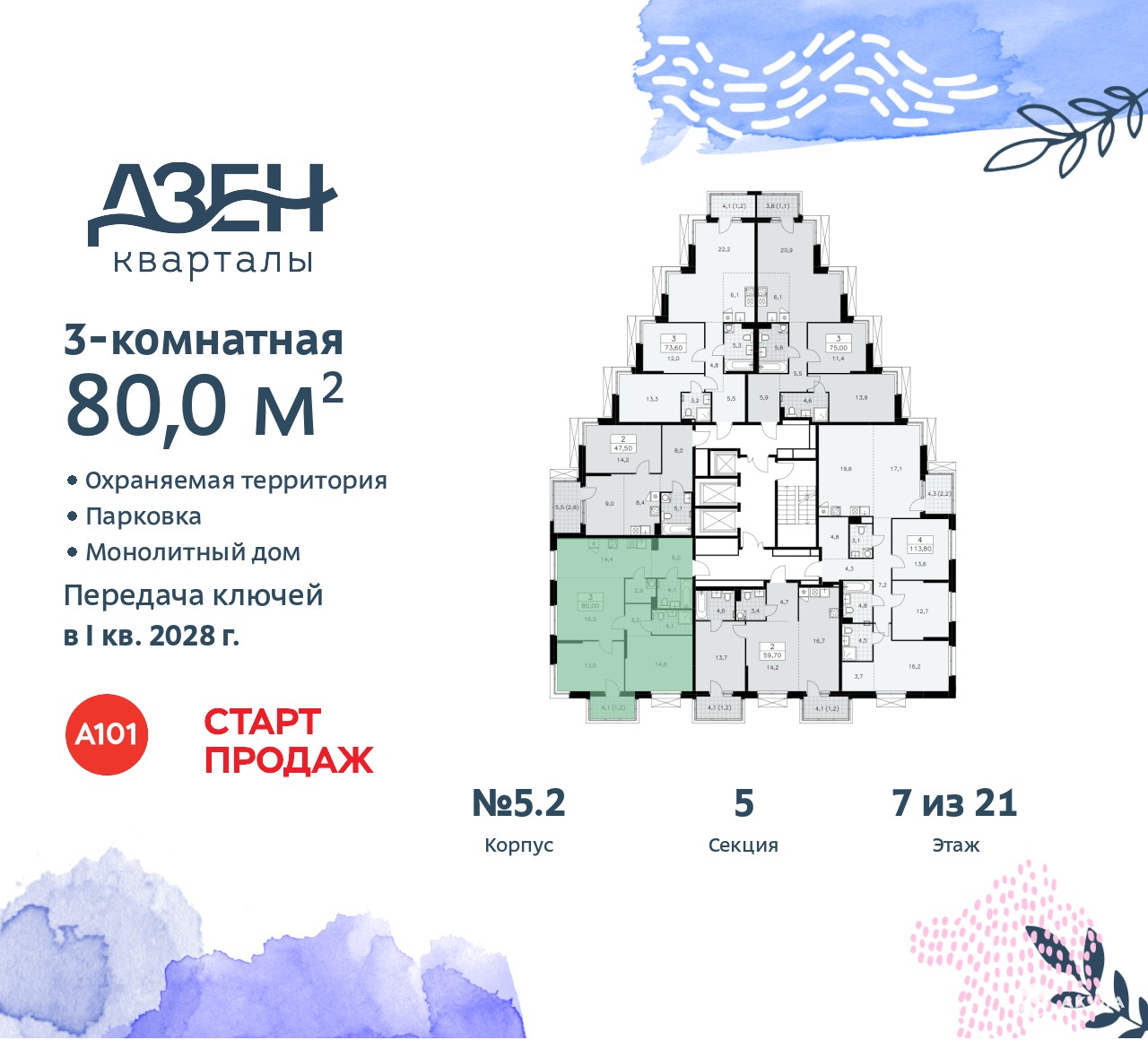 Квартира находится в корпусе 5.2. Дом монолитный, одноподъездный, высотой 21 этаж. На этаже 6 квартир. В подъезде 1 пассажирский и 2 грузовых лифта. Начало строительства - 3 квартал 2025 года. Окончание строительства - 1 квартал 2028 года. Оформление сделки по договору долевого участия.