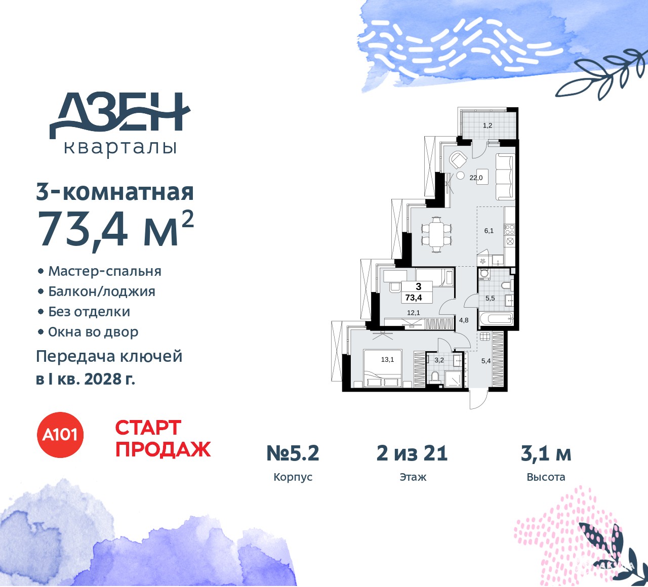 3-комн. квартира бизнес-класса с европланировкой от застройщика в ЖК "Дзен-кварталы" на 2 этаже. Квартира без отделки, полностью готова к чистовой отделке и дальнейшему ремонту. Общая площадь: 73.4 кв.м., жилая: 47.2 кв.м., общая площадь гостиной-столовой с кухонной зоной: 28.1 кв.м. Европланировка, за счет большой площади кухни-гостиной квартира выглядит просторной и очень удобна для жизни. Угловая квартира, идеально подойдет любителям тишины и панорамных видов. В квартире один балкон, два совмещенных санузла. Высота потолков 3.1 м.