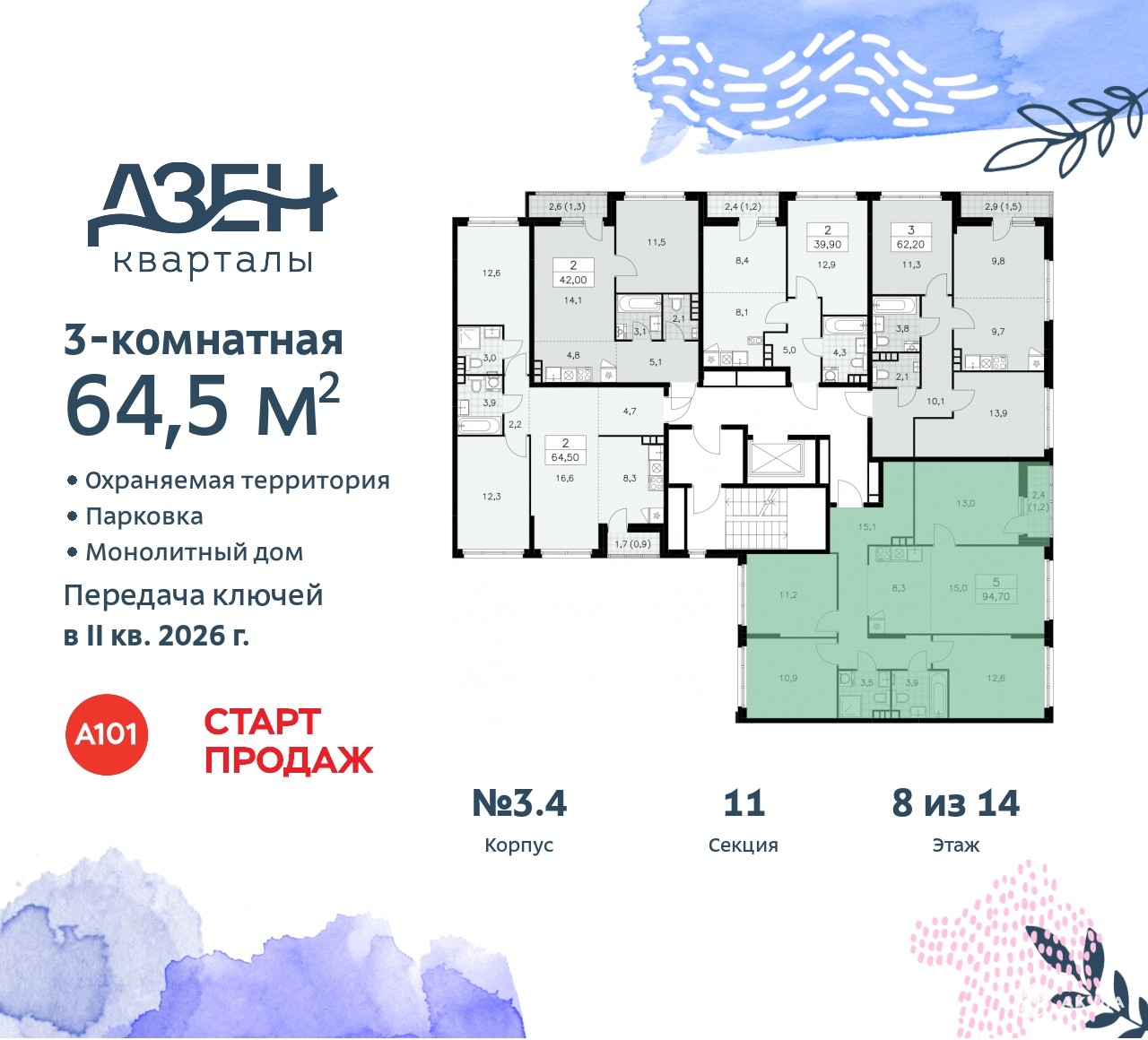 Продается 3-комн. квартира с европланировкой и предчистовой отделкой в ЖК "Дзен-кварталы" на 8 этаже. Общая площадь: 64.5 кв.м., жилая: 41.5 кв.м., суммарная площадь гостиной-столовой с кухонной зоной: 24.9 кв.м. Европланировка, зона гостиной комнаты объединена с кухней. Квартира - распашонка, без проходных комнат, окна выходят на paзные стороны дома. В квартире одна лоджия, два совмещенных санузла. Высота потолков 2.95 м.