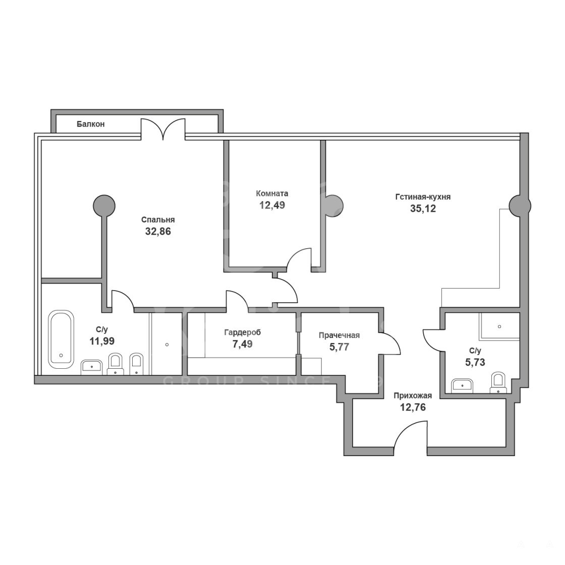 Гостиная 35 кв. м. с кухонной и обеденной зонами. Мастер-спальня 32, 8 кв. м. с балконом, к которой примыкает отдельная зона кабинета. Мастер-санузел с окном, ванной и душевой кабиной. Вторая спальня/детская 12, 5 кв. м. Вместительная гардеробная 7, 5 кв. м. и постирочная 5, 8 кв. м. Второй санузел с душевой кабиной. Большая прихожая 12, 7 кв. м. Под всеми полами, где плитка, установлен подогрев. Канальное кондиционирование и приточно-вытяжная вентиляция. Установлены фильтры для воды. Техника Neff.