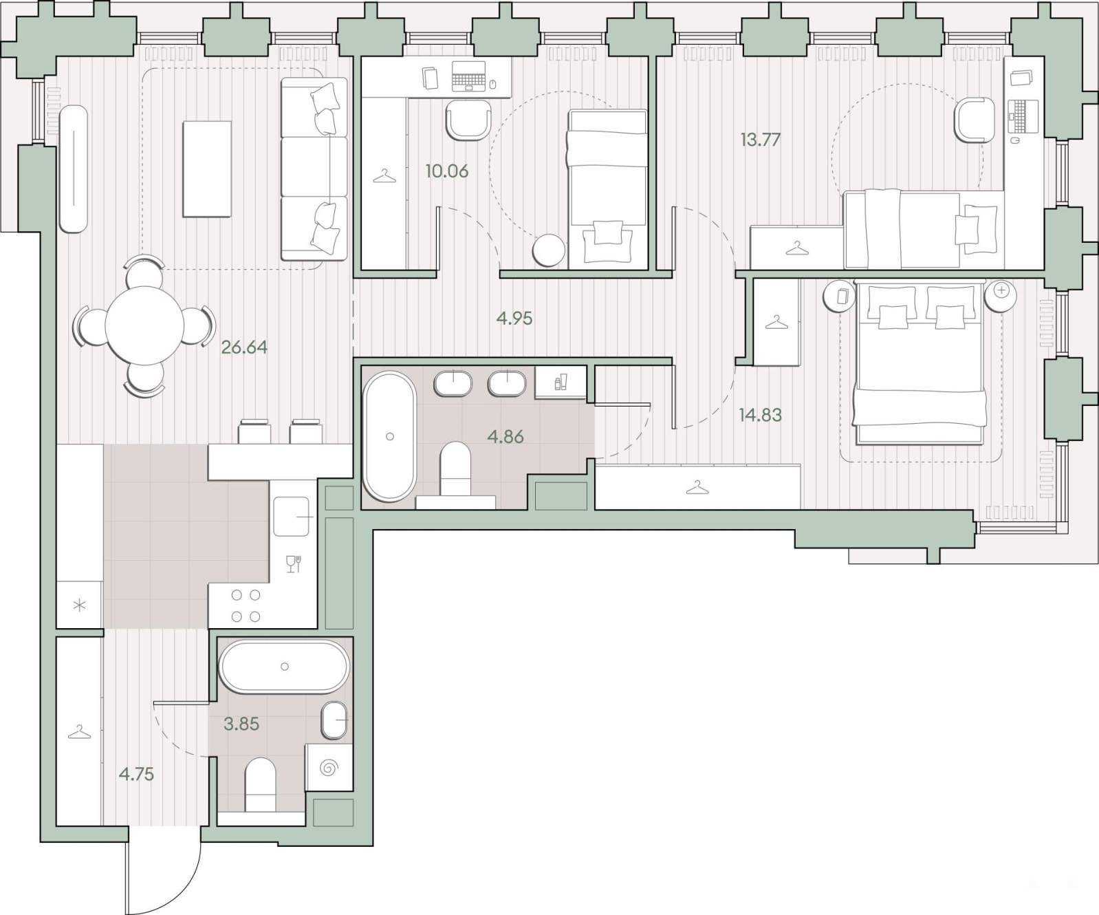 Жилая площадь 38.66 м2, кухня 26.64 м2, предчистовая отделка, комнаты изолированные.