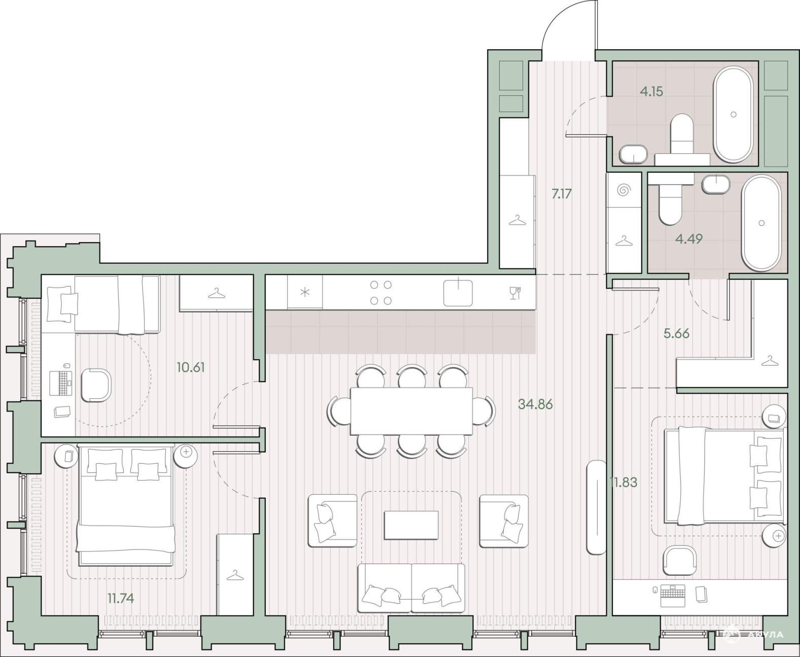 Жилая площадь 34.18 м2, кухня 34.86 м2, квартира без отделки, комнаты изолированные.