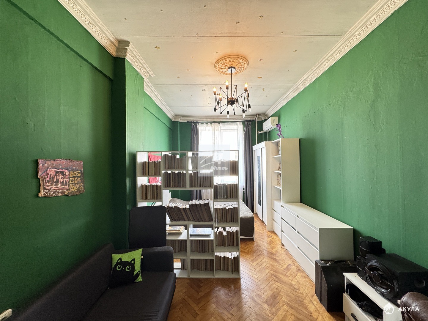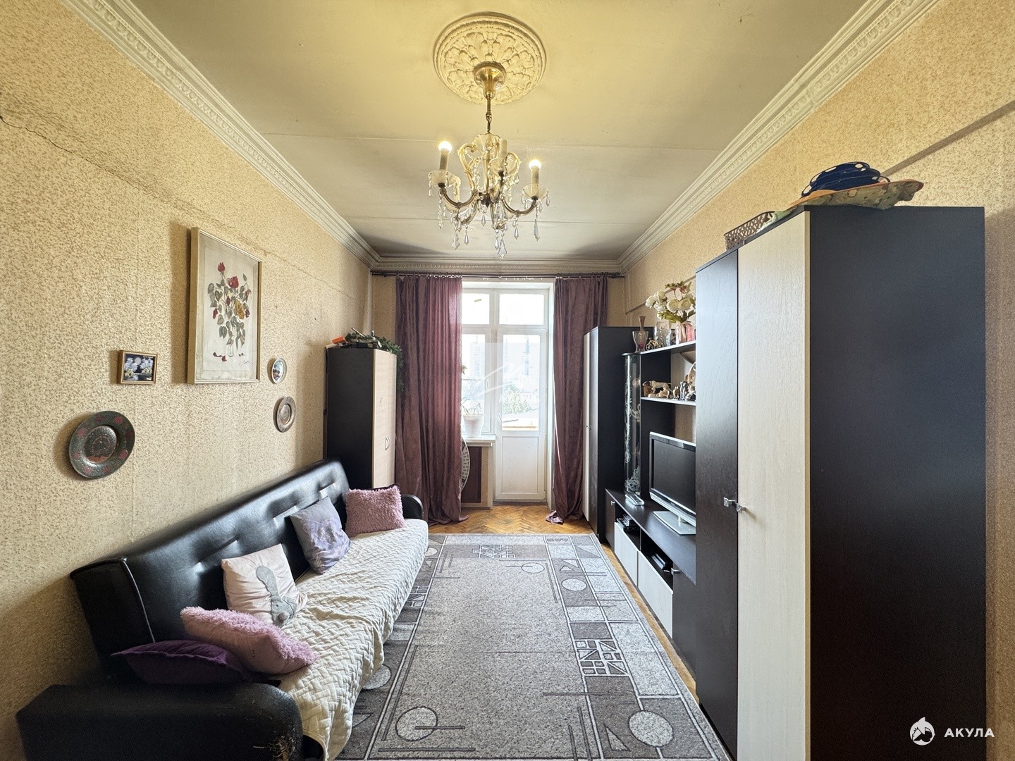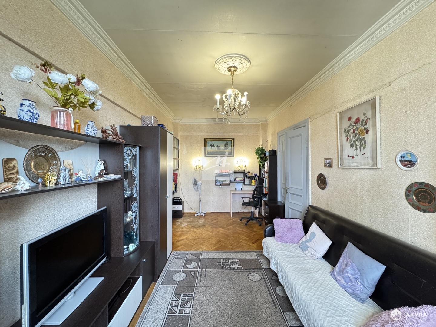 Квартира расположена на 9 этаже девятиэтажного кирпичного дома 1954 года постройки. Общая площадь составляет 91, 5 кв. м, из которых 56, 4 кв. м — жилая площадь. Высота потолков — 3 метра, что создаёт дополнительное ощущение простора и свободы.