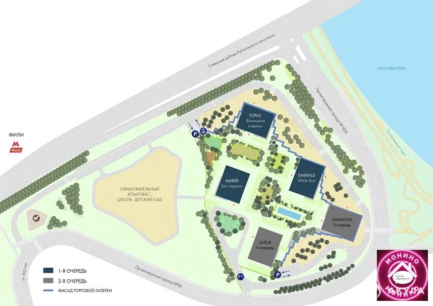 Башни объединены стилобатом с коммерческой недвижимостью. На первом этаже откроются фитнес-клуб, салон красоты, химчистка, магазины и кафе. В проект входят школа, детский сад и трехярусный подземный паркинг, рассчитанный на 1268 автомобилей.