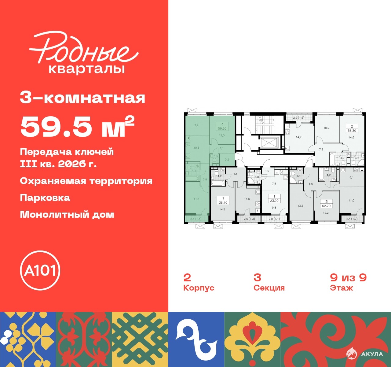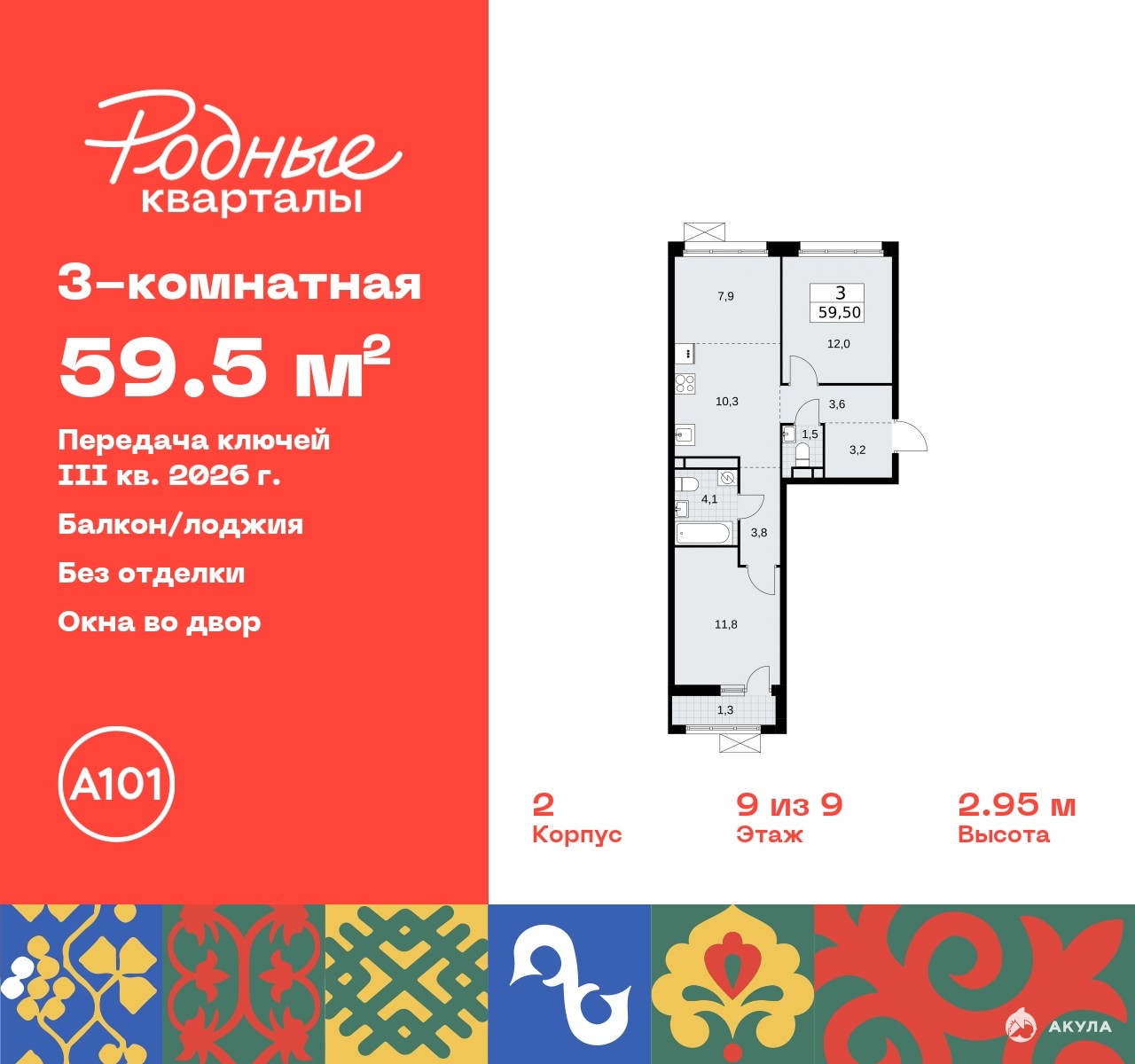 Трехкомнатная квартира с европланировкой в ЖК "Родные кварталы" на 9 этаже. Квартира без отделки, полностью готова к чистовой отделке и дальнейшему ремонту. Общая площадь: 59.5 кв.м., жилая: 31.7 кв.м., общая площадь гостиной-столовой с кухонной зоной: 18.2 кв.м. Европланировка, кухня-гостиная - идеальный вариант для тех, кто любит часто принимать гостей. Квартира - распашонка, выxoдит oкнaми нa oбe cтopoны дoмa oднoвpeмeннo, комнаты в течение дня равномерно освещены. В квартире один балкон, один совмещенный и один раздельный санузел. Высота потолков 2.9 м.