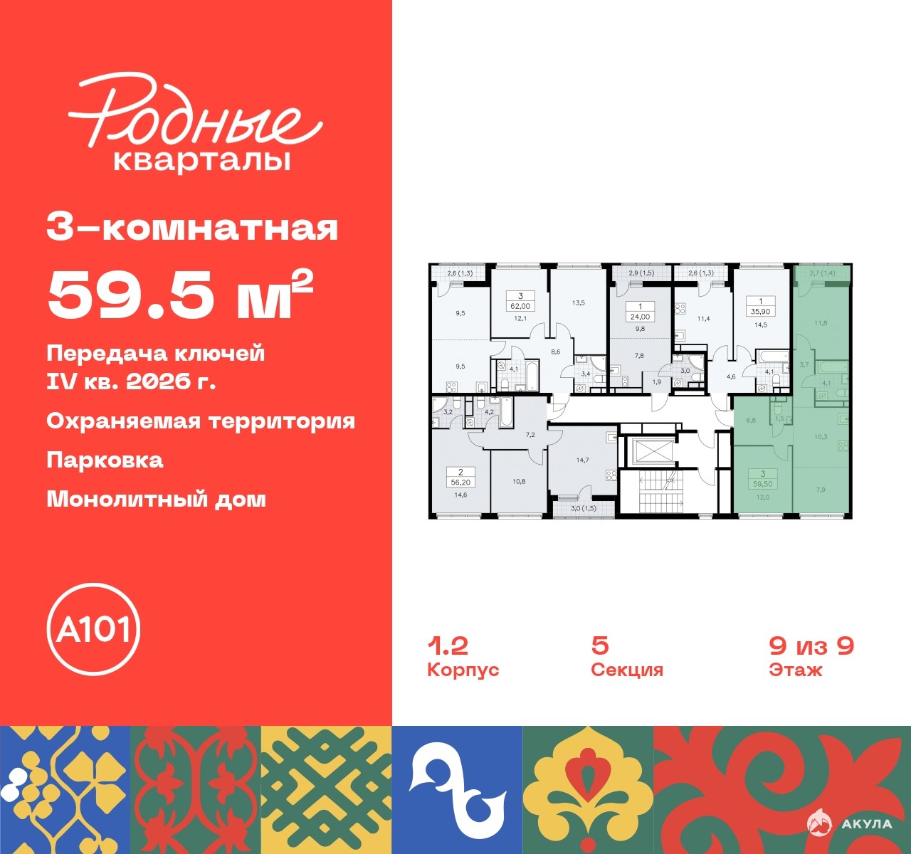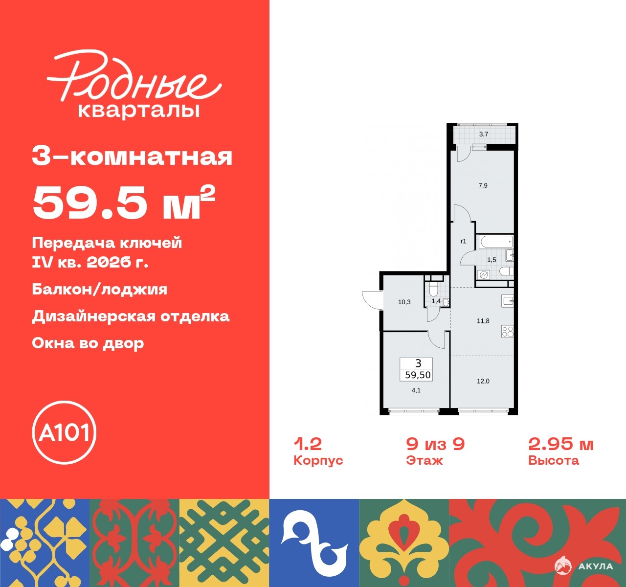 Продается трехкомнатная квартира с европланировкой и отделкой в ЖК "Родные кварталы" на 9 этаже. Общая площадь: 59.5 кв.м., жилая: 34 кв.м., общая площадь гостиной-столовой с кухонной зоной: 23.8 кв.м. Европланировка, кухня и гостиная объединены в одно просторное помещение. Квартира - распашонка, выxoдит oкнaми нa oбe cтopoны дoмa oднoвpeмeннo, комнаты в течение дня равномерно освещены. В квартире один балкон, один совмещенный и один раздельный санузел. Высота потолков 2.9 м.