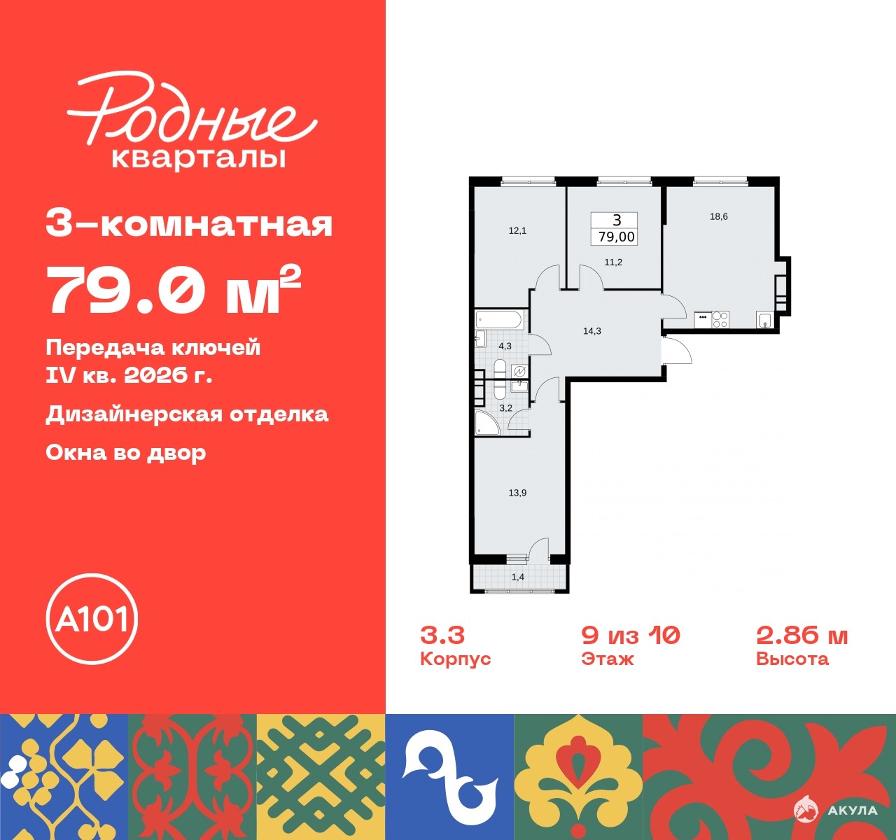 Трехкомнатная квартира с отделкой в ЖК "Родные кварталы" на 9 этаже. Общая площадь: 79 кв.м., жилая: 37.2 кв.м., площадь просторной кухни-столовой: 18.6 кв.м. Квартира - распашонка, без проходных комнат, окна выходят на paзные стороны дома. В квартире один балкон, два совмещенных санузла. Высота потолков 2.95 м.