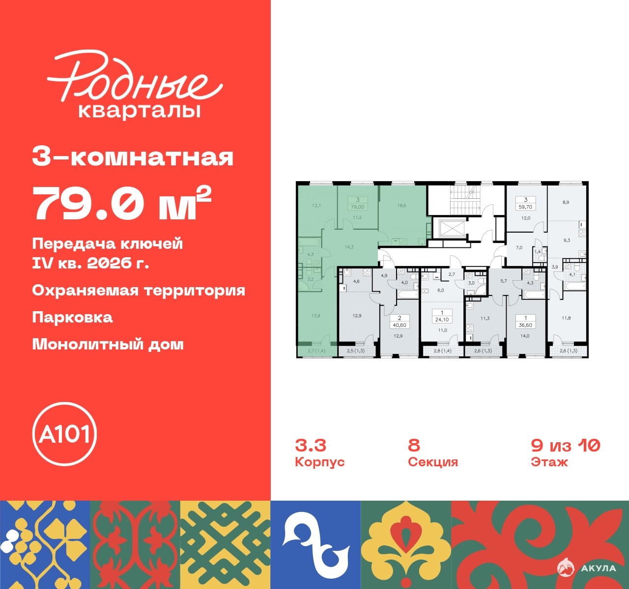 Дом монолитный, черырехподъездный, переменной этажности, от 9 до 10 этажей. Квартира находится во 2-й секции высотой 10 этажей в корпусе 3.3. На этаже 5 квартир. В подъезде 1 грузовой лифт. Начало строительства - 2 квартал 2024 года. Окончание строительства - 4 квартал 2026 года. Оформление сделки по договору долевого участия.