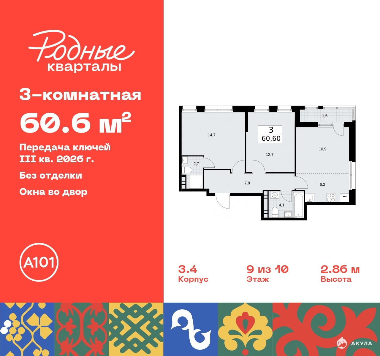 3-комн. квартира с европланировкой от застройщика в ЖК "Родные кварталы" на 9 этаже. Квартира без отделки, полностью готова к ремонту. Общая площадь: 60.6 кв.м., жилая: 36.9 кв.м., суммарная площадь гостиной-столовой с кухонной зоной: 18.6 кв.м. Европланировка, зона гостиной комнаты объединена с кухней. Угловая квартира, идеально подойдет любителям тишины и панорамных видов. В квартире один балкон, два совмещенных санузла. Высота потолков 2.95 м.