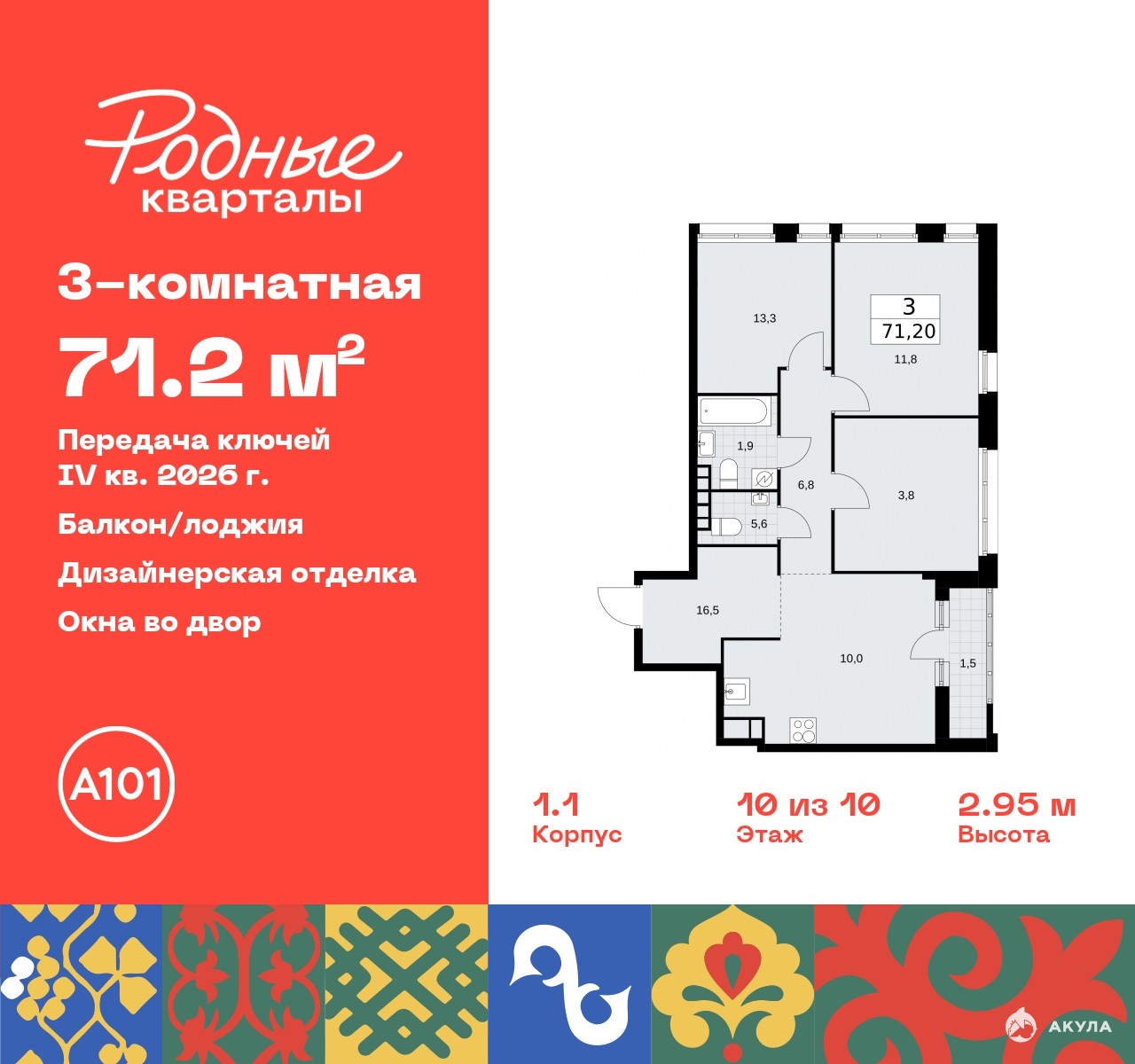3-комн. квартира с отделкой в ЖК "Родные кварталы" на 10 этаже. Общая площадь: 71.2 кв.м., жилая: 28.9 кв.м., площадь просторной кухни-столовой: 10 кв.м. Квартира угловая, идеально подойдет любителям тишины и панорамных видов. В квартире одна лоджия, один совмещенный и один раздельный санузел. Высота потолков 2.9 м.