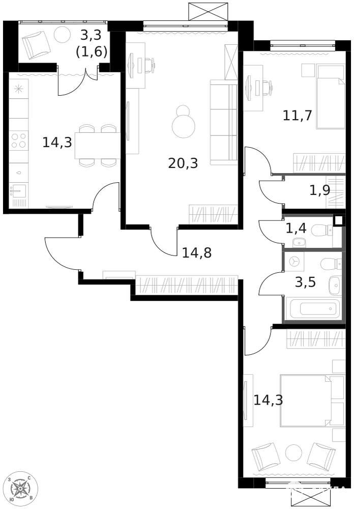 Квартира располагается на 10 этаже 14-этажного панельного дома в ЖК 1-й Ленинградский.