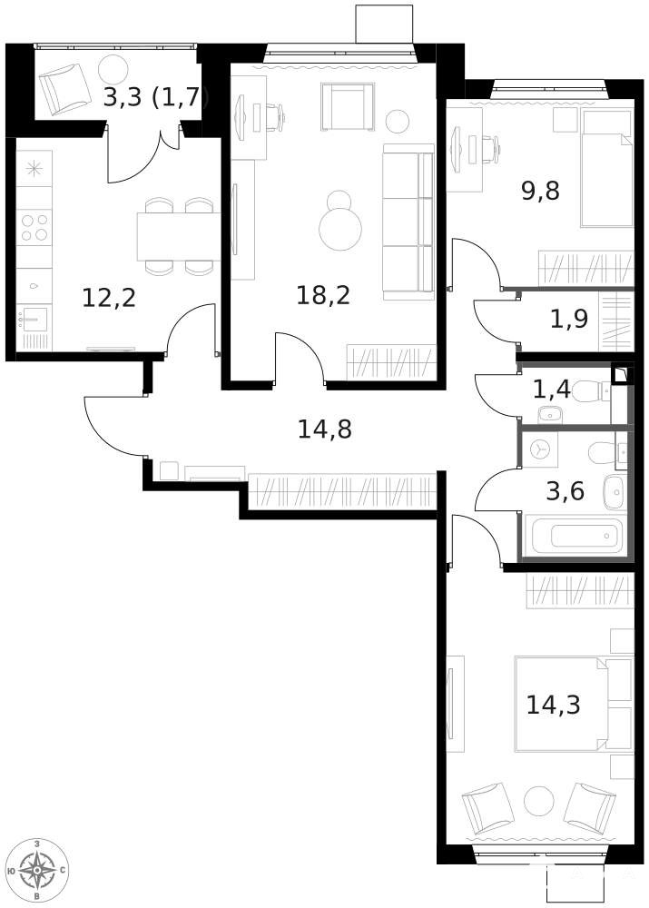 Квартира располагается на 3 этаже 14-этажного панельного дома в ЖК 1-й Ленинградский.
