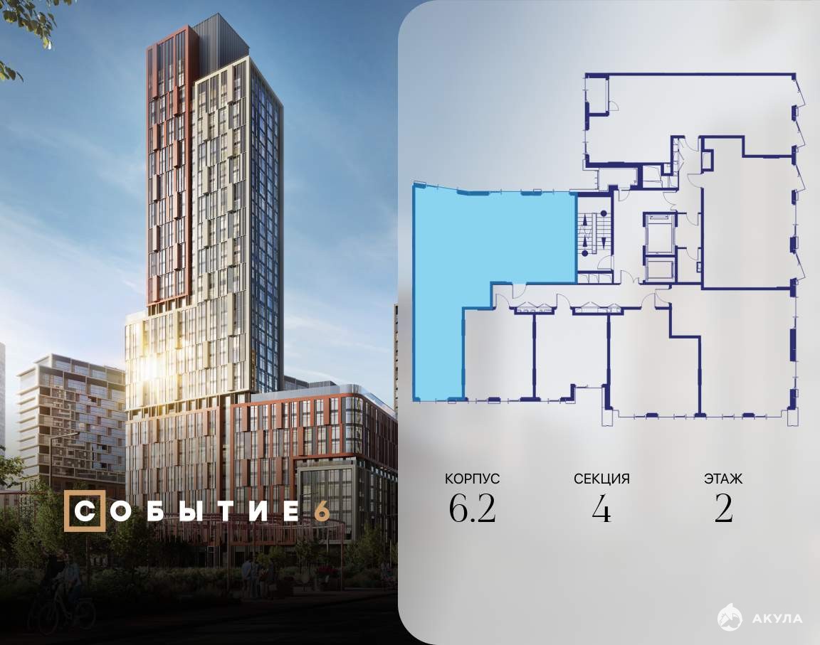 Продаётся 3-комнатная квартира от застройщика: общая площадь 109.70 м, жилая 42.40 м, кухня 23.80 м, 2-й этаж, жилой квартал «Событие-6», корпус 2 (секция 4) Срок сдачи: 1 квартал 2029 года.