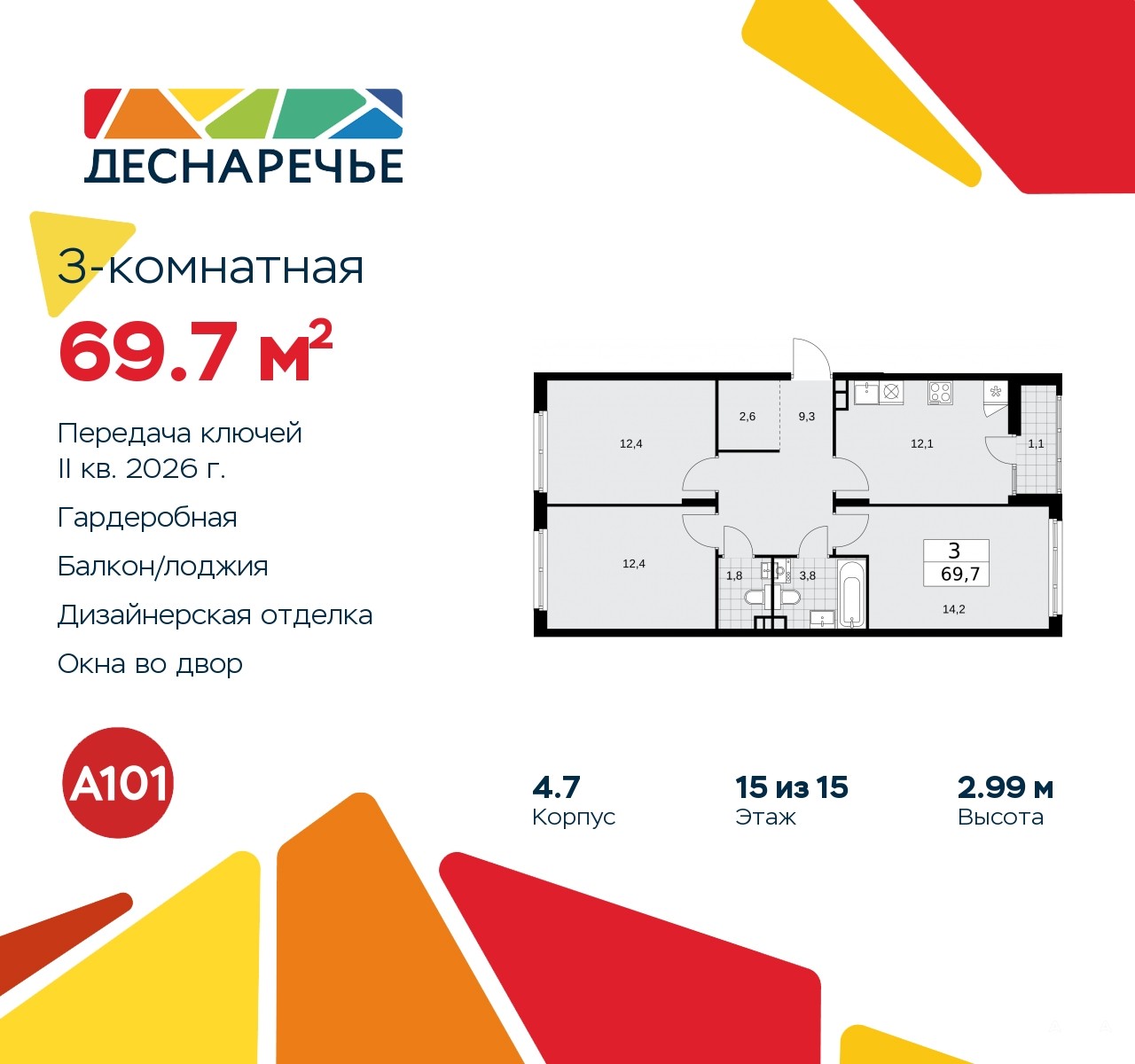 Просторная 3-комн. квартира с отделкой в ЖК "Деснаречье" на 15 этаже. Общая площадь: 69.7 кв.м., жилая: 39 кв.м., площадь просторной кухни-столовой: 12.1 кв.м. Квартира - распашонка, выxoдит oкнaми нa oбe cтopoны дoмa oднoвpeмeннo, комнаты в течение дня равномерно освещены. В квартире одна лоджия, один совмещенный и один раздельный санузел. Высота потолков 2.99 м.