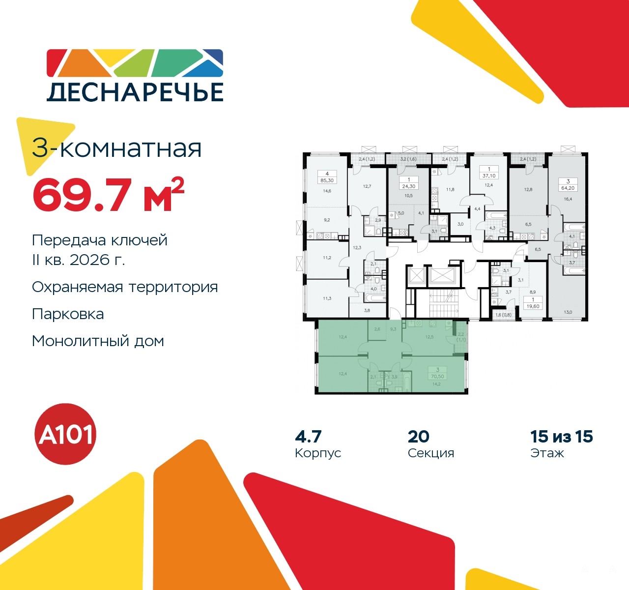 Дом монолитный, трехподъездный, высотой 15 этажей. Квартира находится во 2-й секции в корпусе 4.7. На этаже 6 квартир. В подъезде 1 пассажирский и 1 грузовой лифт. Начало строительства - 3 квартал 2023 года. Окончание строительства - 2 квартал 2026 года. Оформление сделки по договору долевого участия.