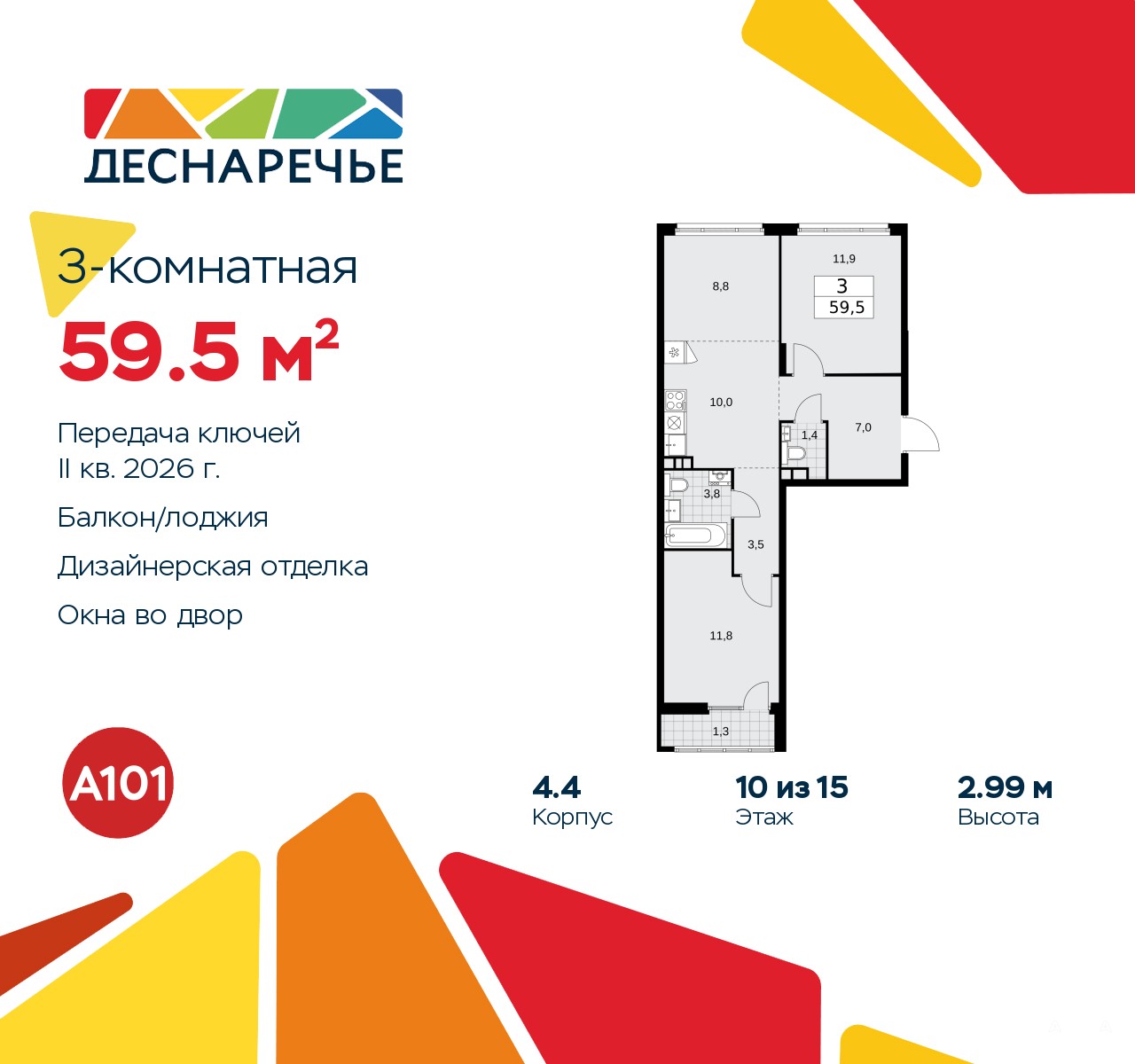 Просторная 3-комн. квартира с европланировкой и предчистовой отделкой в ЖК "Деснаречье" на 10 этаже. Общая площадь: 59.5 кв.м., жилая: 32.5 кв.м., суммарная площадь гостиной-столовой с кухонной зоной: 18.8 кв.м. Европланировка, зона гостиной комнаты объединена с кухней. Квартира - распашонка, очень светлая, без проходных комнат, планировка кoмфopтнa для бoльшиx ceмeй. В квартире один балкон, один совмещенный и один раздельный санузел. Высота потолков 2.99 м.