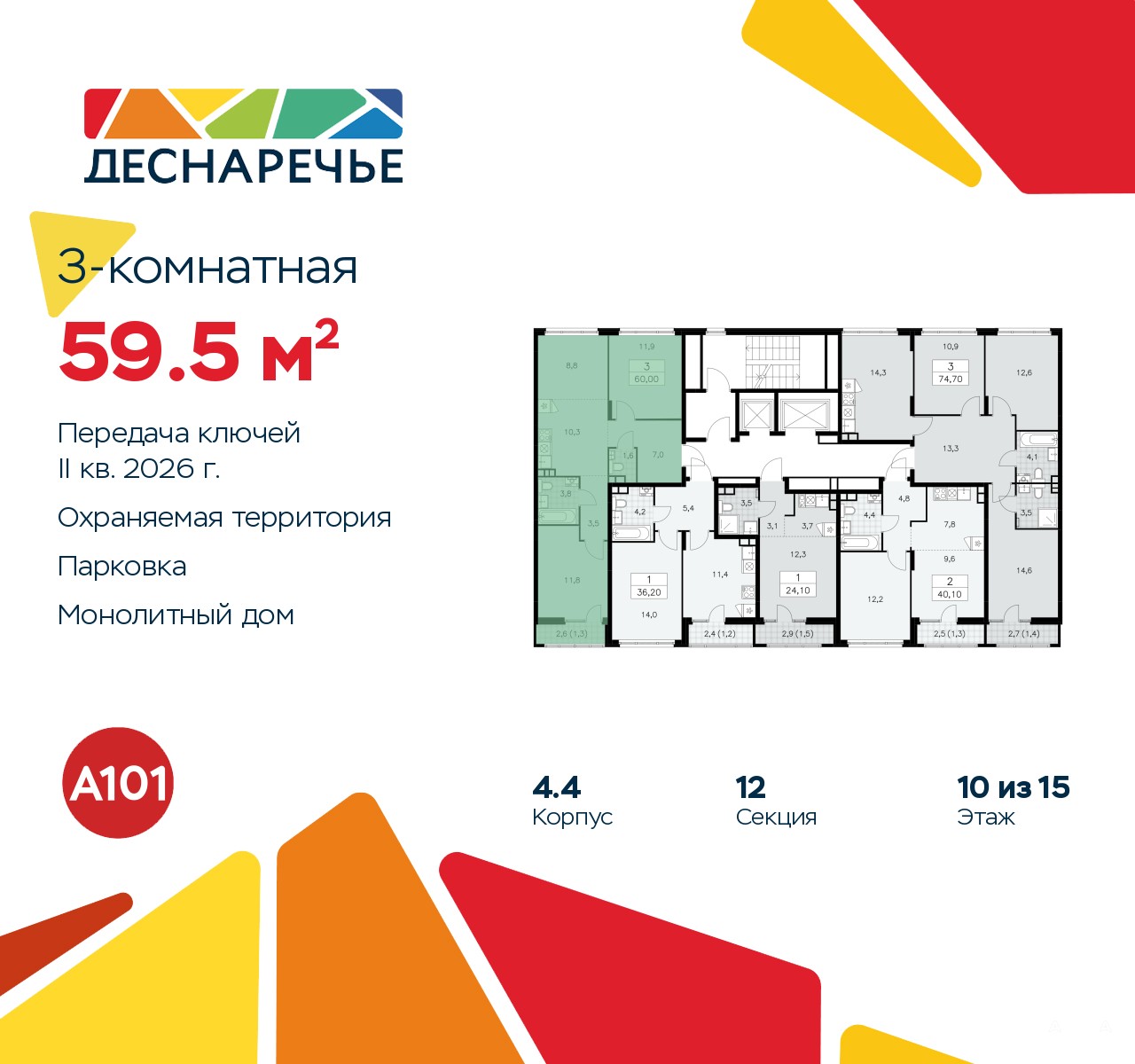 Дом монолитный, черырехподъездный, высотой 15 этажей. Квартира находится в 3-й секции в корпусе 4.4. На этаже 5 квартир. В подъезде 1 пассажирский и 1 грузовой лифт. Начало строительства - 3 квартал 2023 года. Окончание строительства - 2 квартал 2026 года. Оформление сделки по договору долевого участия.