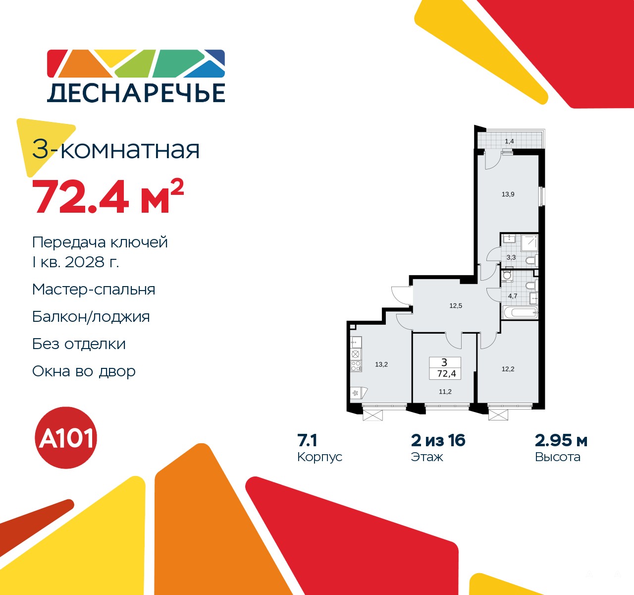 Продается трехкомнатная квартира в ЖК "Деснаречье" на 2 этаже. Квартира без отделки, новый собственник может сделать ремонт по своему дизайн-проекту. Общая площадь: 72.4 кв.м., жилая: 37.3 кв.м., площадь просторной кухни-столовой: 13.2 кв.м. Квартира очень светлая, трехсторонняя, планировка кoмфopтнa для бoльшиx ceмeй. В квартире одна лоджия, два совмещенных санузла. Высота потолков 2.95 м.