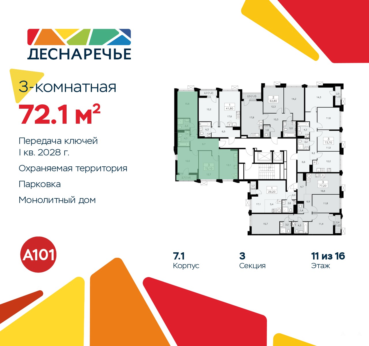 3-комн. квартира от застройщика в ЖК "Деснаречье" на 11 этаже. Квартира без отделки, полностью готова к чистовой отделке и дальнейшему ремонту. Общая площадь: 72.1 кв.м., жилая: 40.38 кв.м., площадь просторной кухни-столовой: 13.1 кв.м. Квартира без проходных комнат, окна выходят нa три cтopoны дома. В квартире одна лоджия, два совмещенных санузла. Высота потолков 2.95 м.