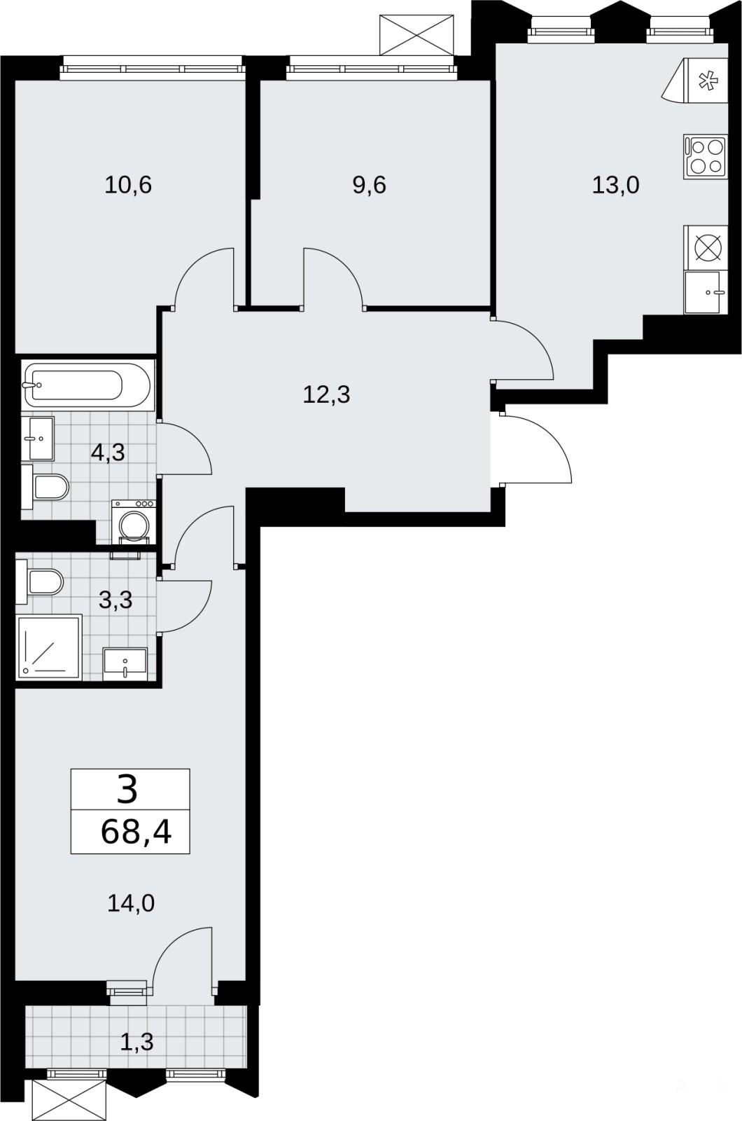 Просторная трехкомнатная квартира в ЖК "Деснаречье" на 11 этаже. Квартира без отделки, после выдачи ключей можно делать ремонт. Общая площадь: 68.4 кв.м., жилая: 34.2 кв.м., площадь просторной кухни-столовой: 13 кв.м. Квартира - распашонка, без проходных комнат, окна выходят на paзные стороны дома. В квартире одна лоджия, два совмещенных санузла. Высота потолков 2.95 м.
