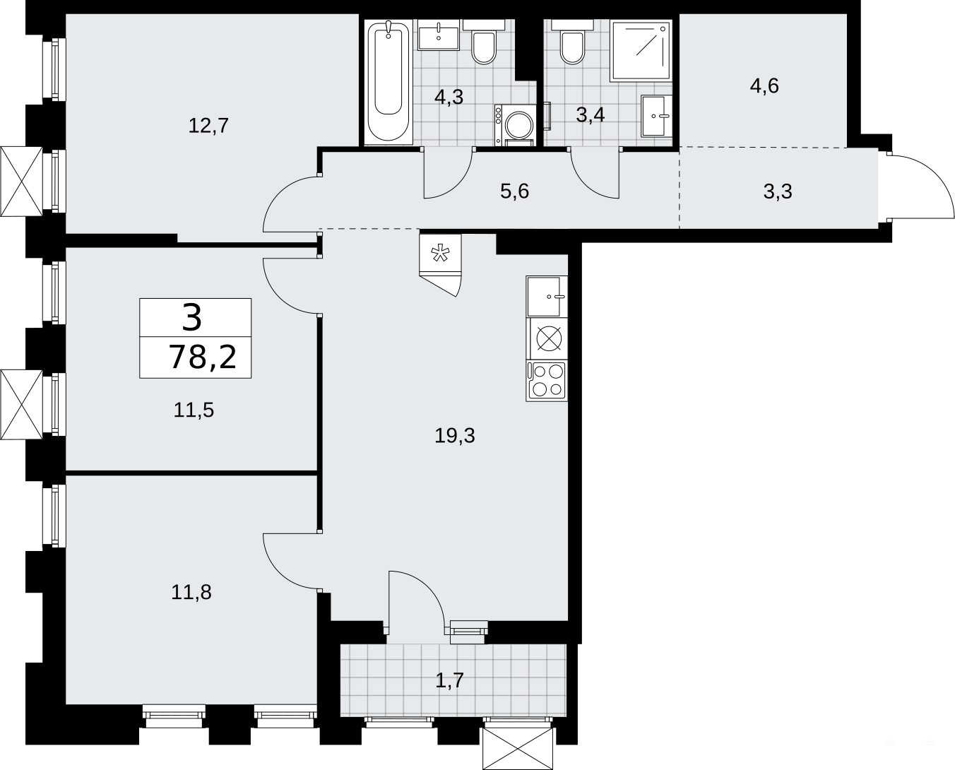 Просторная трехкомнатная квартира с отделкой в ЖК "Деснаречье" на 20 этаже. Общая площадь: 78.2 кв.м., жилая: 36 кв.м., площадь просторной кухни-столовой: 19.3 кв.м. Квартира угловая, окна oбecпeчивaют paвнoмepнoe ocвeщeниe в тeчeниe дня. В квартире одна лоджия, два совмещенных санузла. Высота потолков 2.95 м.