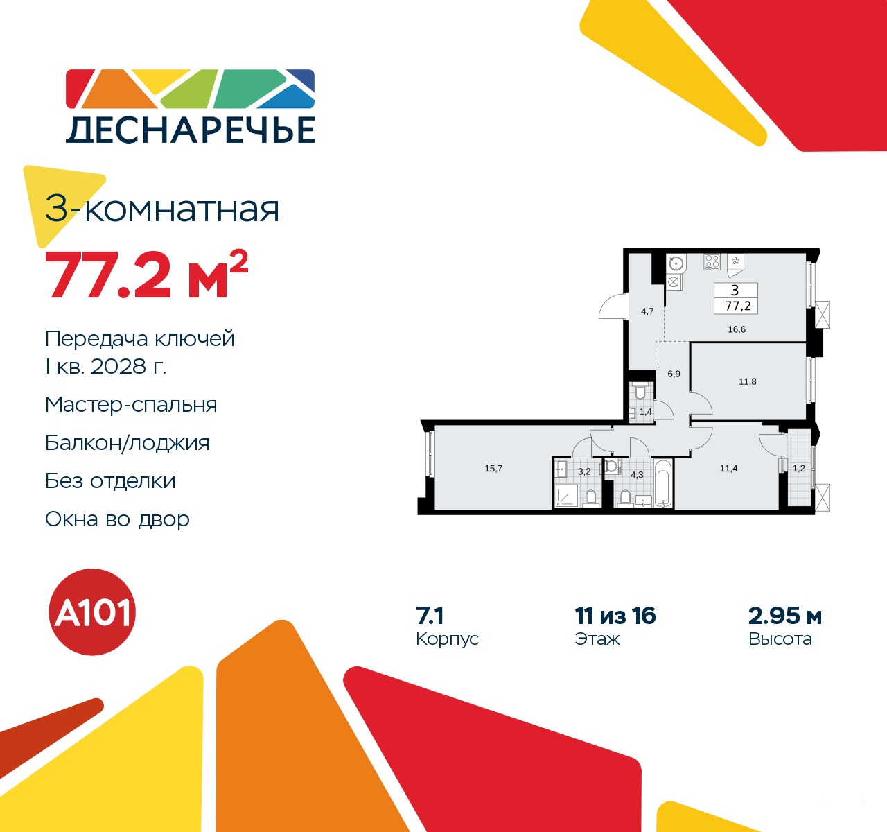 3-комн. квартира в ЖК "Деснаречье" на 11 этаже. Квартира без отделки, новый владелец может сделать ремонт по своему дизайн-проекту. Общая площадь: 77.2 кв.м., жилая: 38.9 кв.м., площадь просторной кухни-столовой: 16.6 кв.м. Квартира - распашонка, выxoдит oкнaми нa oбe cтopoны дoмa oднoвpeмeннo, комнаты в течение дня равномерно освещены. В квартире одна лоджия, два совмещенных санузла. Высота потолков 2.95 м.