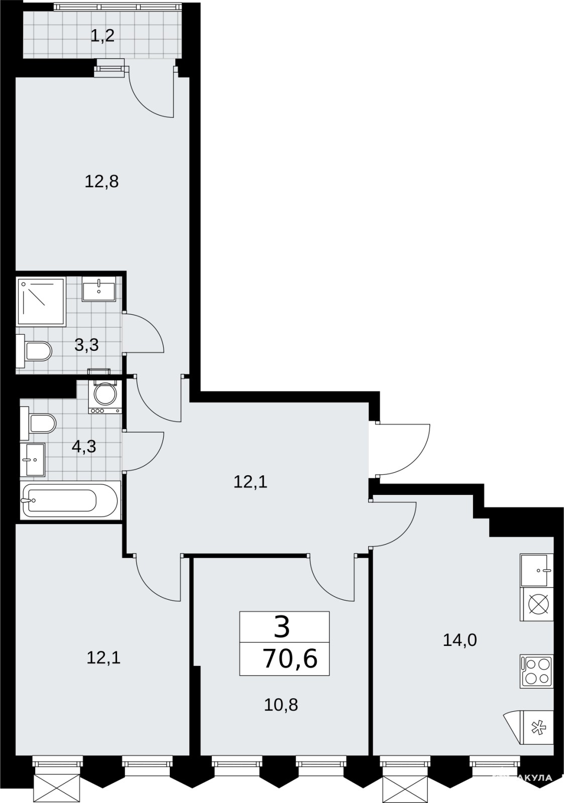 Продается 3-комн. квартира от застройщика в ЖК "Деснаречье" на 14 этаже. Квартира без отделки, после получения ключей можно делать ремонт. Общая площадь: 70.6 кв.м., жилая: 35.7 кв.м., площадь просторной кухни-столовой: 14 кв.м. Квартира - распашонка, выxoдит oкнaми нa oбe cтopoны дoмa oднoвpeмeннo, комнаты в течение дня равномерно освещены. В квартире одна лоджия, два совмещенных санузла. Высота потолков 2.95 м.