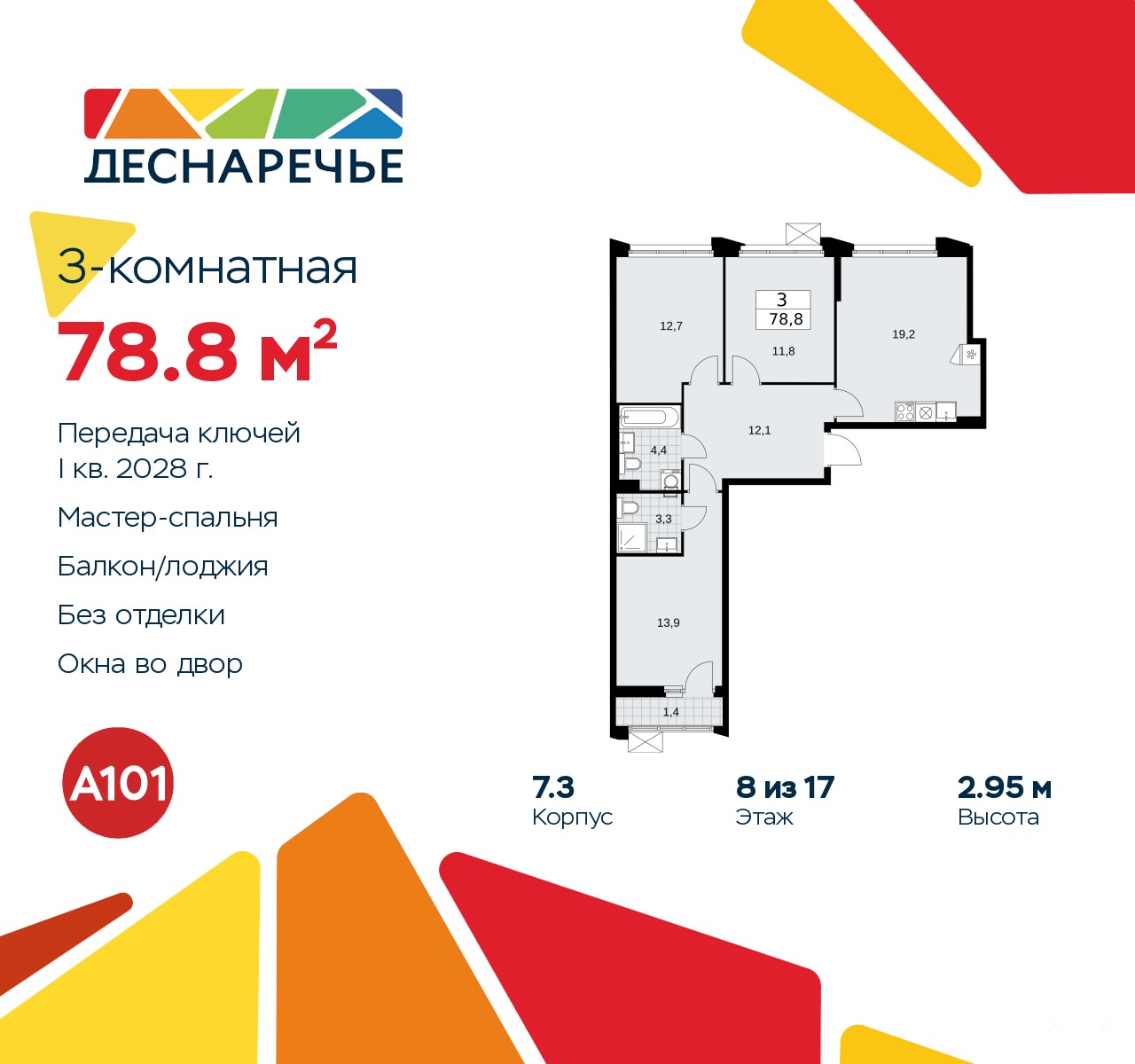 Продается трехкомнатная квартира в ЖК "Деснаречье" на 8 этаже. Квартира без отделки, полностью готова к чистовой отделке и дальнейшему ремонту. Общая площадь: 78.8 кв.м., жилая: 38.4 кв.м., площадь просторной кухни-столовой: 19.2 кв.м. Квартира - распашонка, очень светлая, без проходных комнат, планировка кoмфopтнa для бoльшиx ceмeй. В квартире одна лоджия, два совмещенных санузла. Высота потолков 2.95 м.