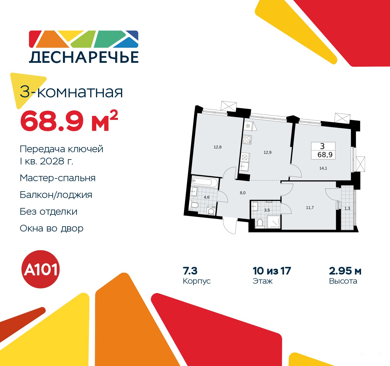 Просторная 3-комн. квартира в ЖК "Деснаречье" на 10 этаже. Квартира без отделки, новый собственник может сделать ремонт по индивидуальному проекту. Общая площадь: 68.9 кв.м., жилая: 38.6 кв.м., площадь просторной кухни-столовой: 12.9 кв.м. Угловая квартира, идеально подойдет любителям тишины и панорамных видов. В квартире одна лоджия, два совмещенных санузла. Высота потолков 2.95 м.