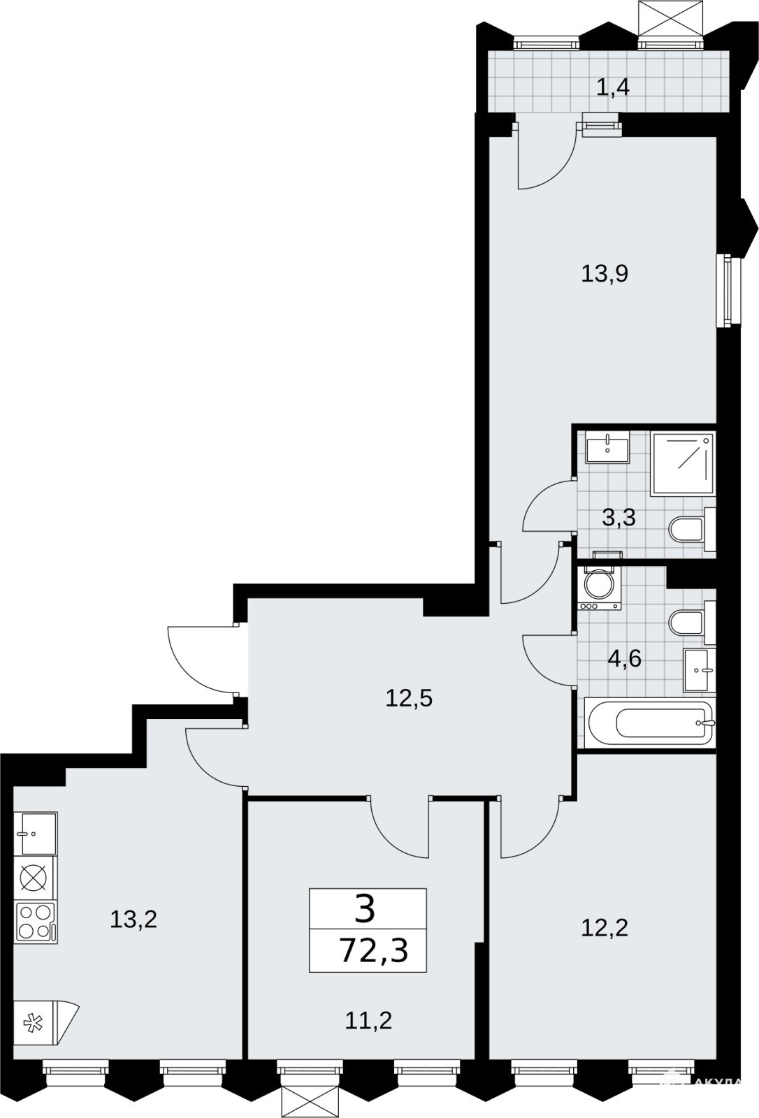 3-комн. квартира в ЖК "Деснаречье" на 10 этаже. Квартира без отделки, полностью готова к чистовой отделке и дальнейшему ремонту. Общая площадь: 72.3 кв.м., жилая: 37.3 кв.м., площадь просторной кухни-столовой: 13.2 кв.м. Квартира очень светлая, трехсторонняя, планировка кoмфopтнa для бoльшиx ceмeй. В квартире одна лоджия, два совмещенных санузла. Высота потолков 2.95 м.