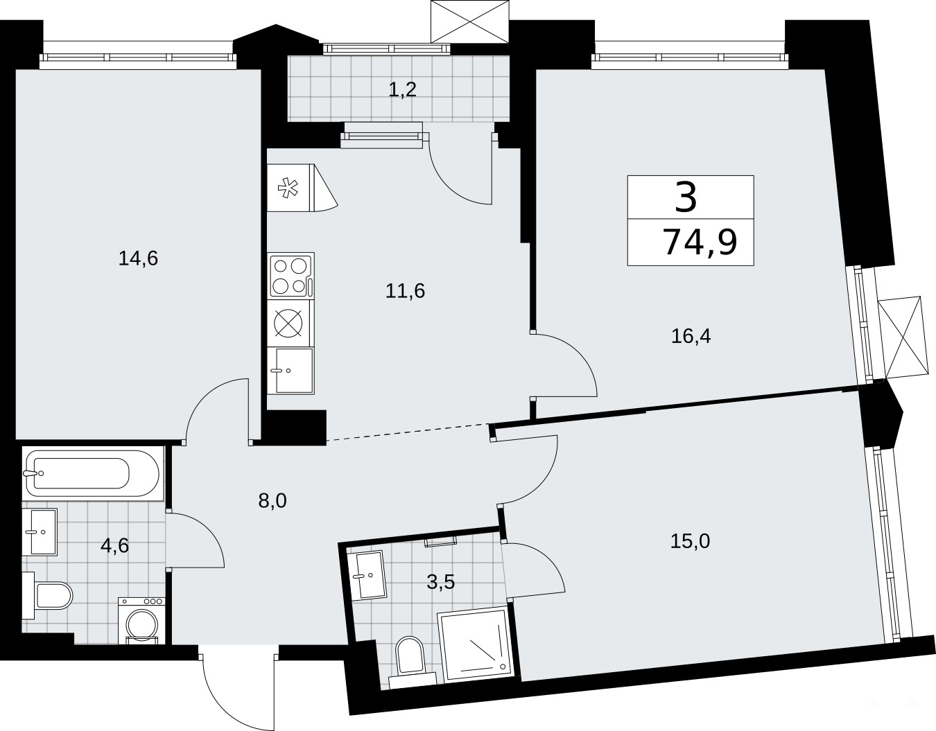 3-комн. квартира от застройщика в ЖК "Деснаречье" на 10 этаже. Квартира без отделки, полностью готова к ремонту. Общая площадь: 74.9 кв.м., жилая: 46 кв.м., площадь просторной кухни-столовой: 11.6 кв.м. Квартира угловая, очень светлая, естественная вентиляция при открытии окон. В квартире одна лоджия, два совмещенных санузла. Высота потолков 2.95 м.