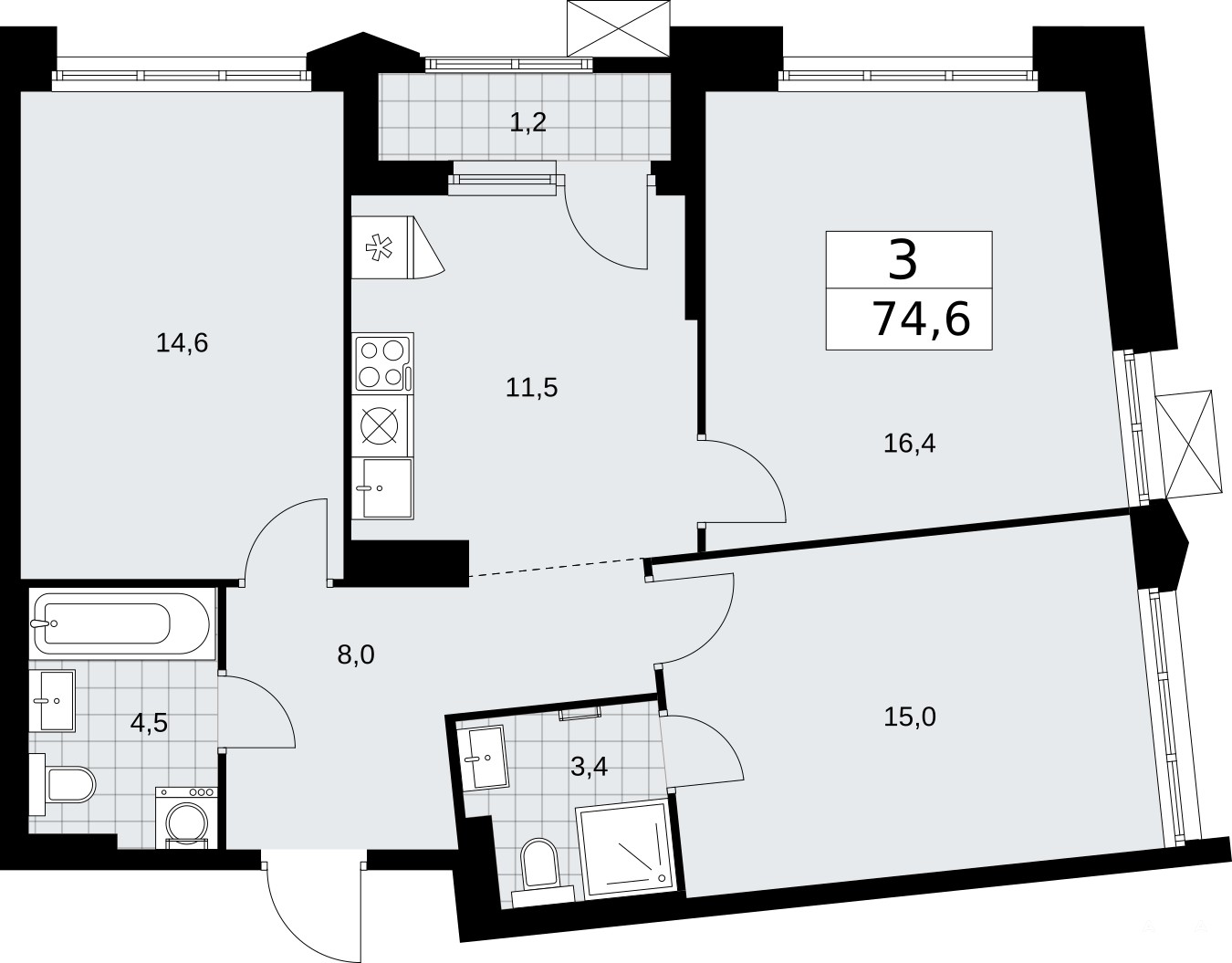 3-комн. квартира в ЖК "Деснаречье" на 15 этаже. Квартира без отделки, после оформления собственности можно делать ремонт. Общая площадь: 74.6 кв.м., жилая: 46 кв.м., площадь просторной кухни-столовой: 11.5 кв.м. Угловая квартира, идеально подойдет любителям тишины и панорамных видов. В квартире одна лоджия, два совмещенных санузла. Высота потолков 2.95 м.