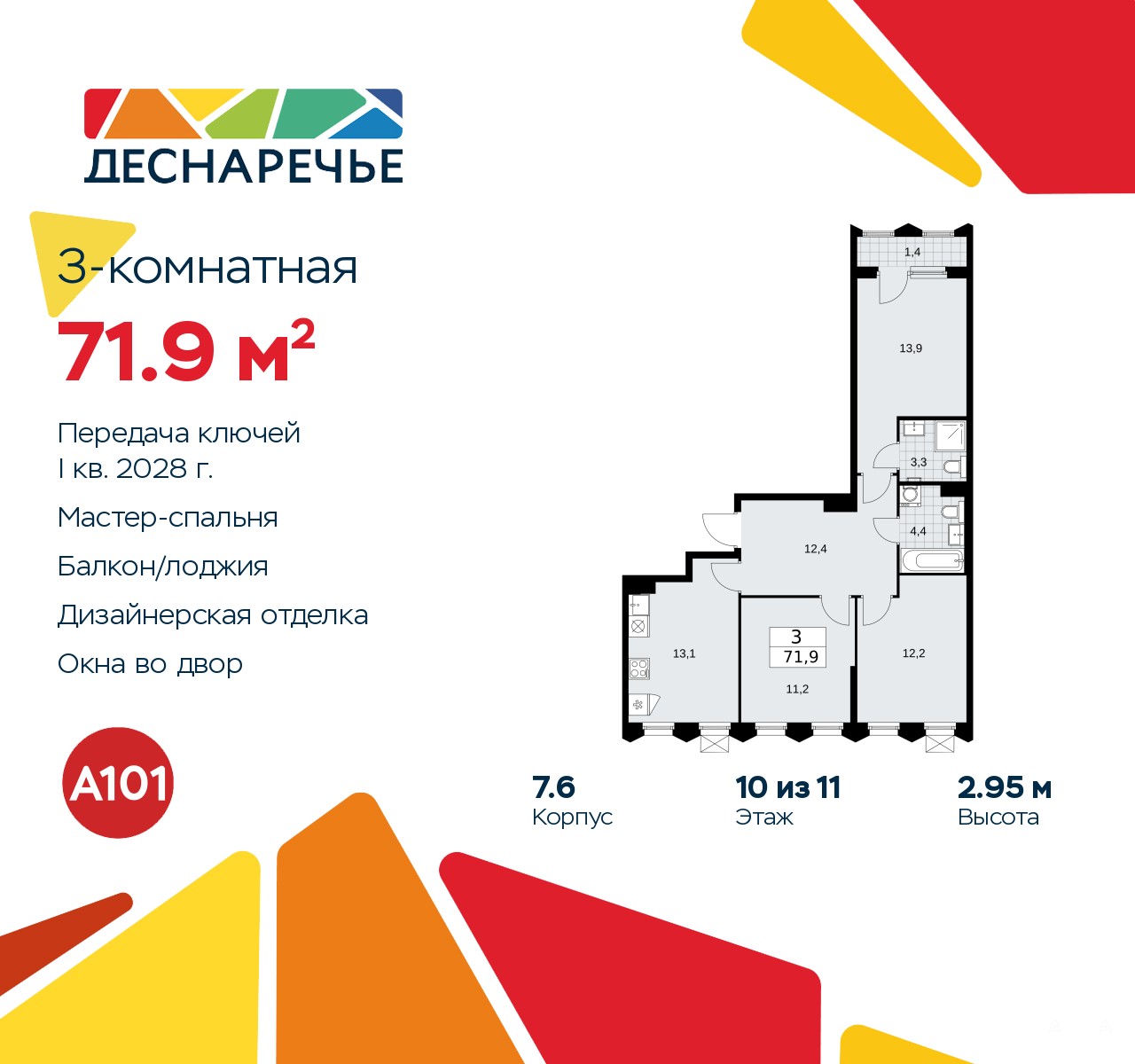 3-комн. квартира с отделкой в ЖК "Деснаречье" на 10 этаже. Общая площадь: 71.9 кв.м., жилая: 37.3 кв.м., площадь просторной кухни-столовой: 13.1 кв.м. Квартира - распашонка, без проходных комнат, окна выходят на paзные стороны дома. В квартире одна лоджия, два совмещенных санузла. Высота потолков 2.95 м.