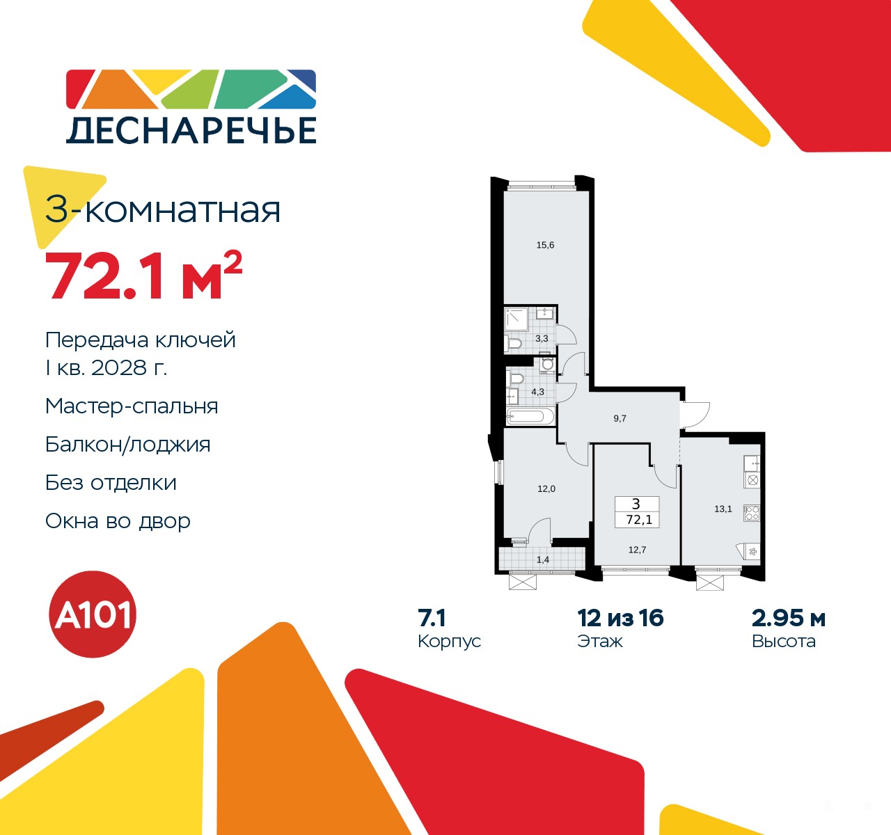 Продается 3-комн. квартира в ЖК "Деснаречье" на 12 этаже. Квартира без отделки, после получения ключей можно делать ремонт. Общая площадь: 72.1 кв.м., жилая: 40.38 кв.м., площадь просторной кухни-столовой: 13.1 кв.м. Квартира без проходных комнат, окна выходят нa три cтopoны дома. В квартире одна лоджия, два совмещенных санузла. Высота потолков 2.95 м.